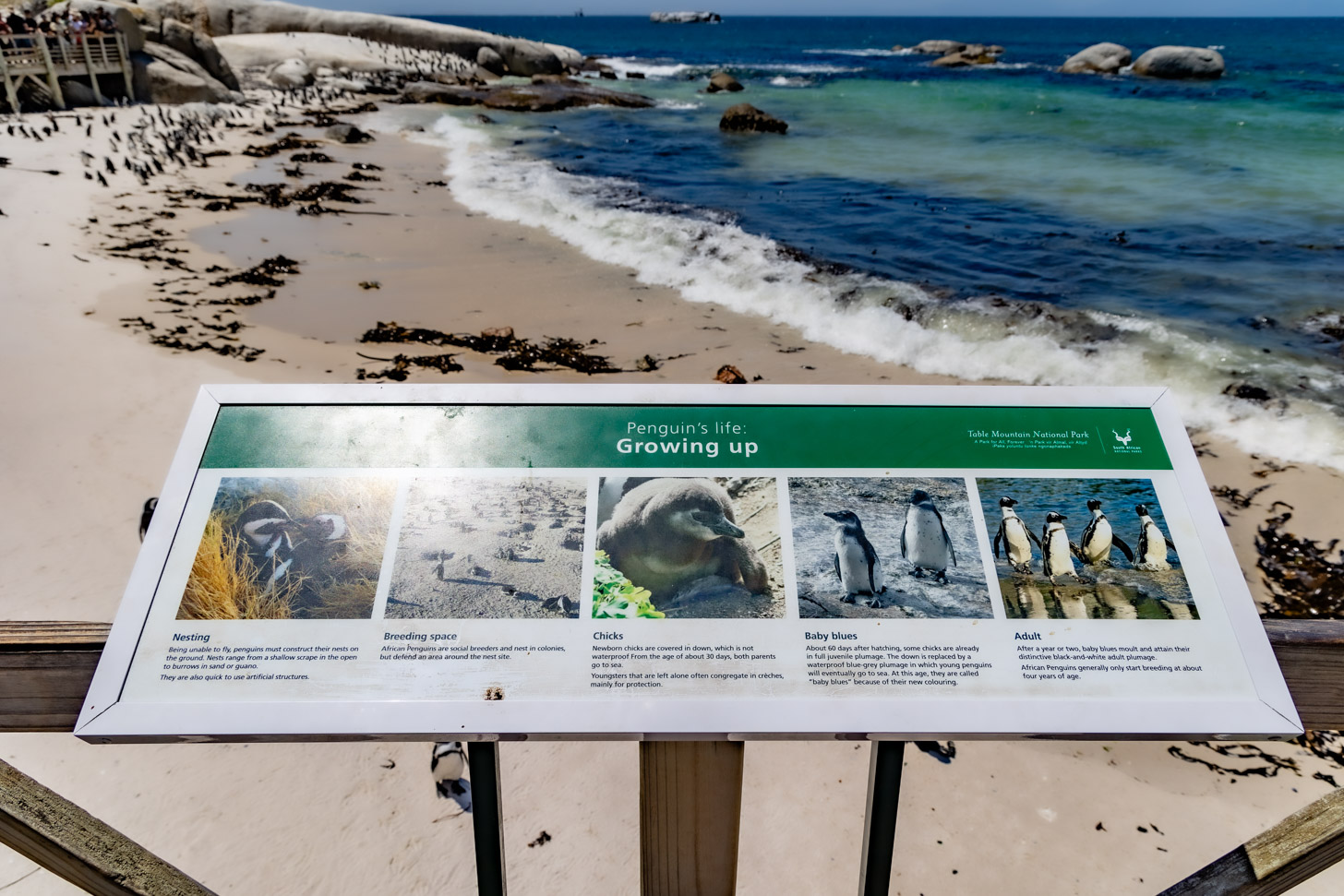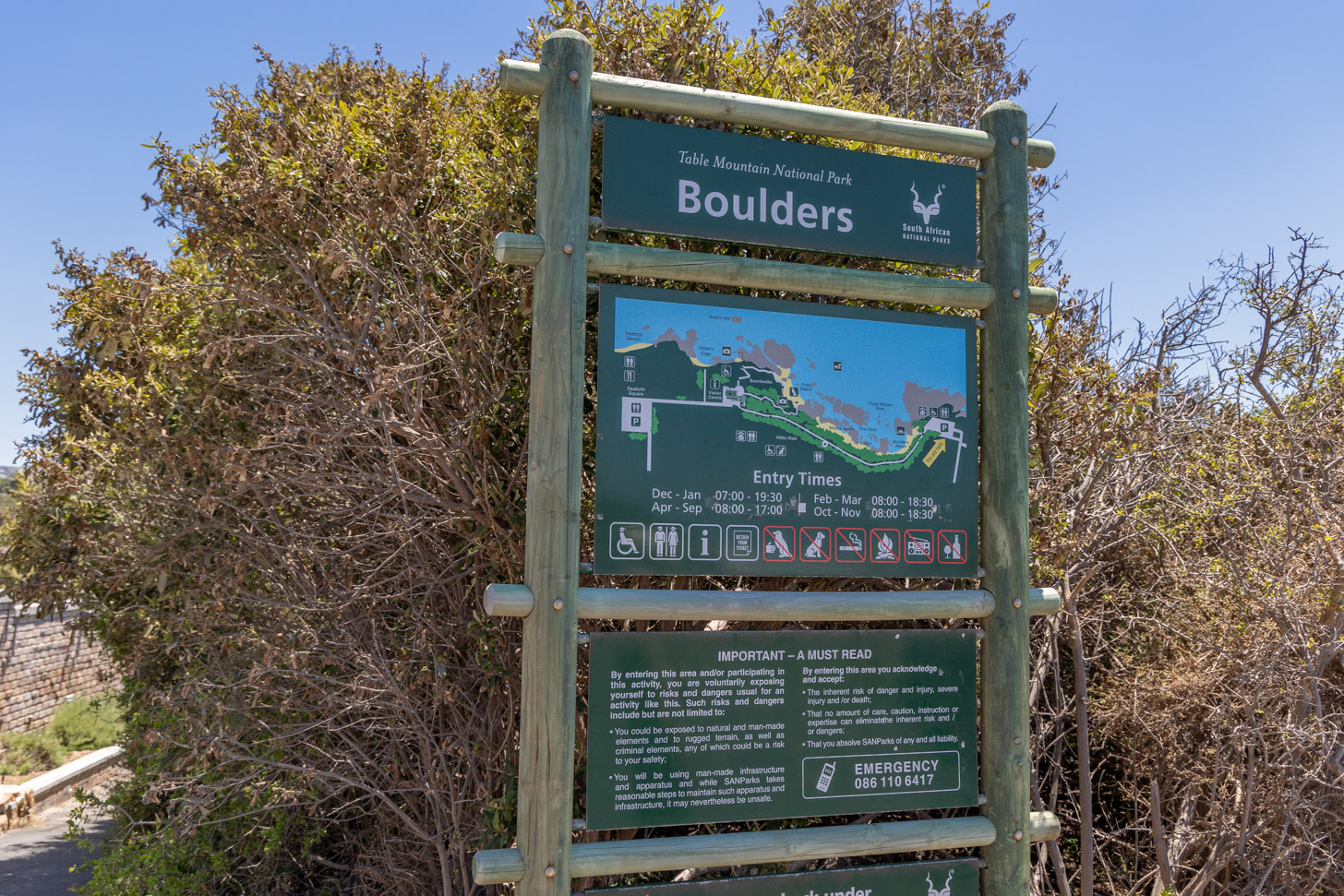 Infobord over Boulders Beach met tijden, parkeerplaatsen en wandelroutes.