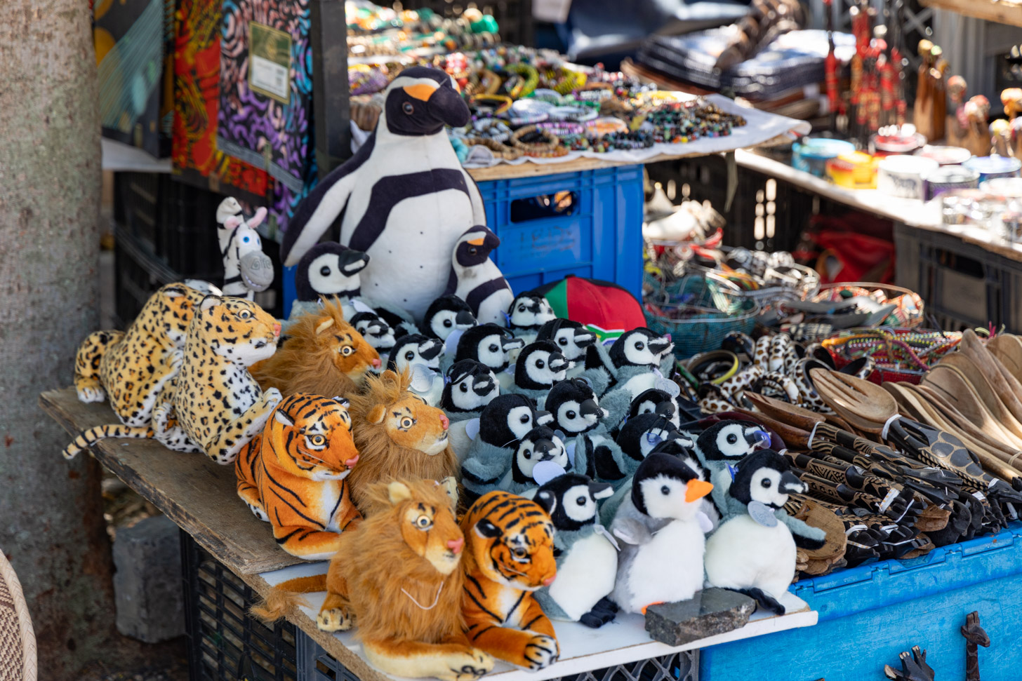 Pinguïnknuffels koop je bij de altijd aanwezige stalletjes.