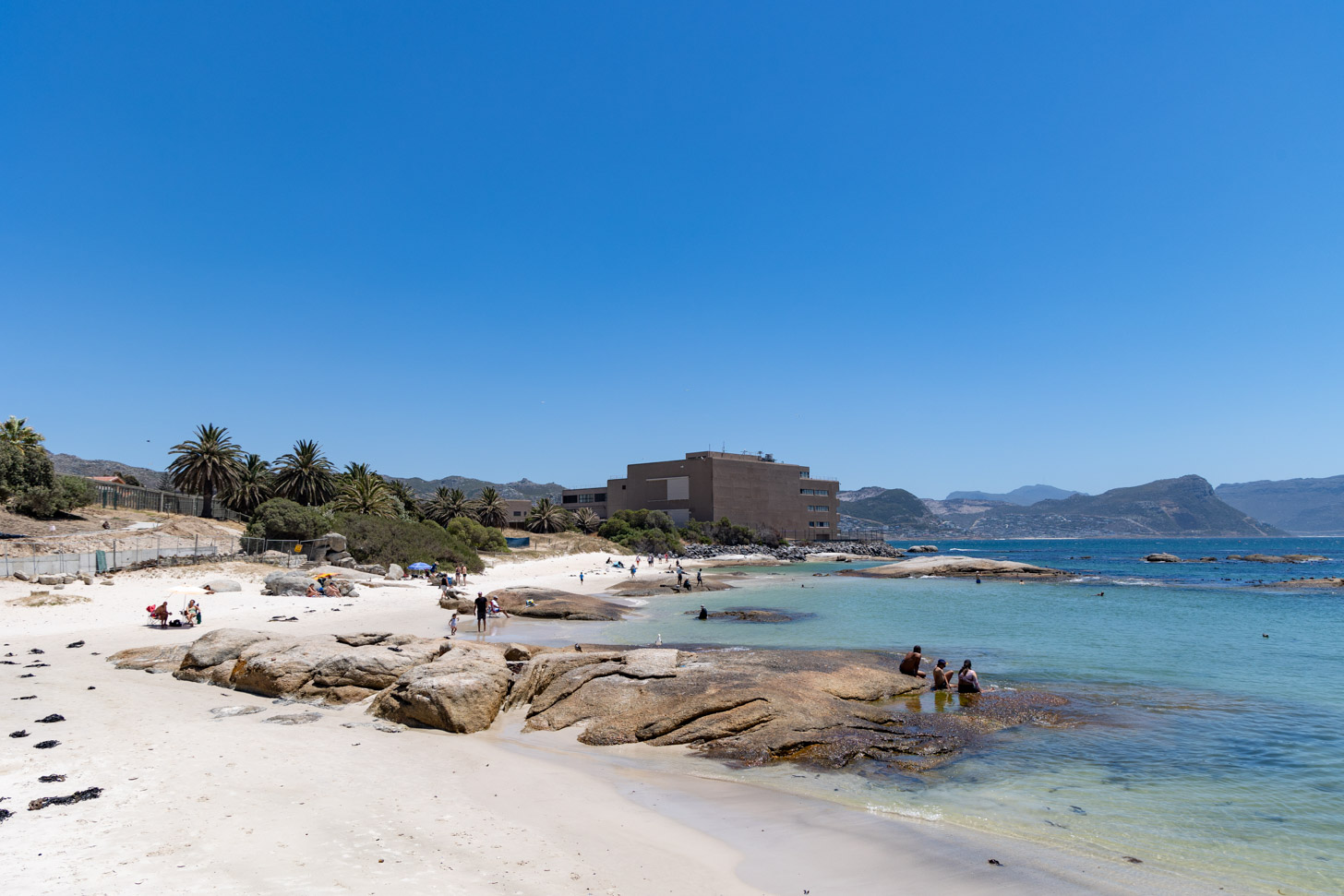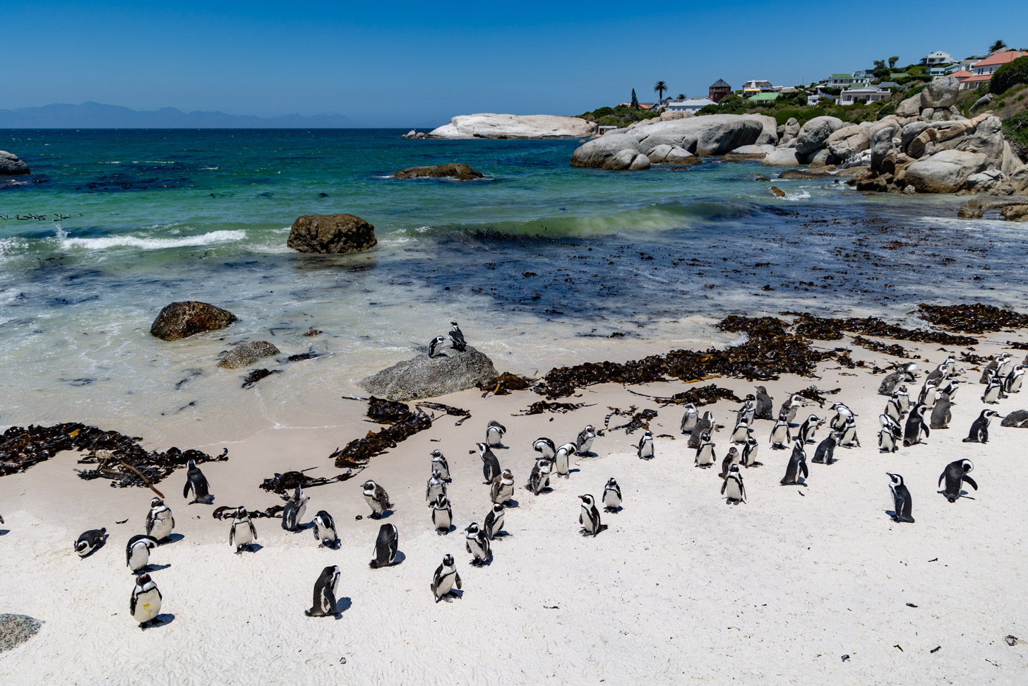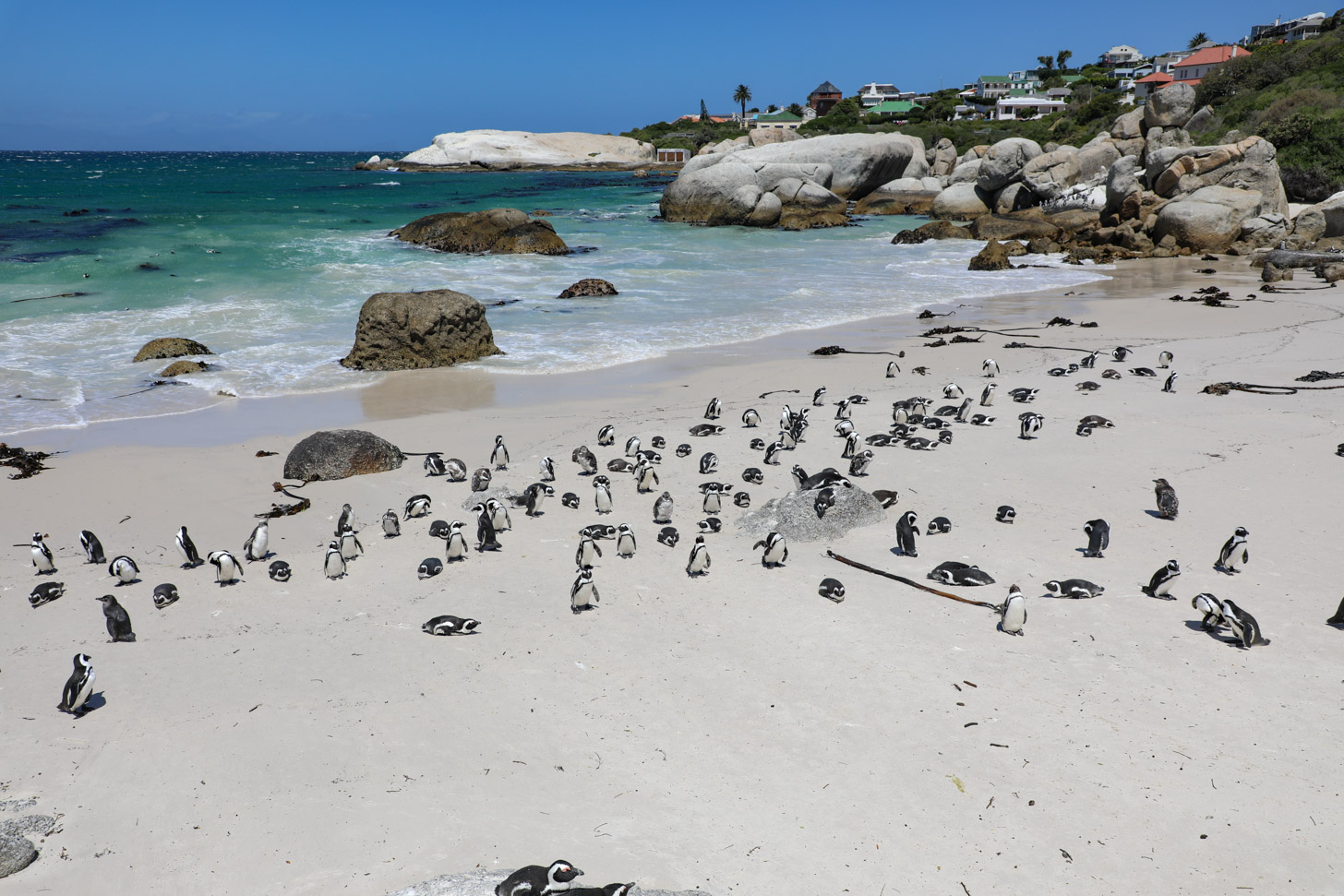 Boulders Beach met daarachter bebouwing. Die bewoners hebben een geweldig uitzicht.