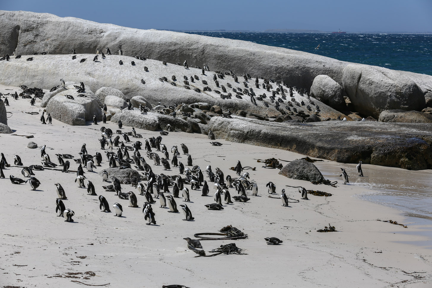 Het vrij toegankelijke strand van Boulders Beach. Hier zie je aanzienlijk minder pinguïns dan in het deel waarvoor je entree moet betalen.
