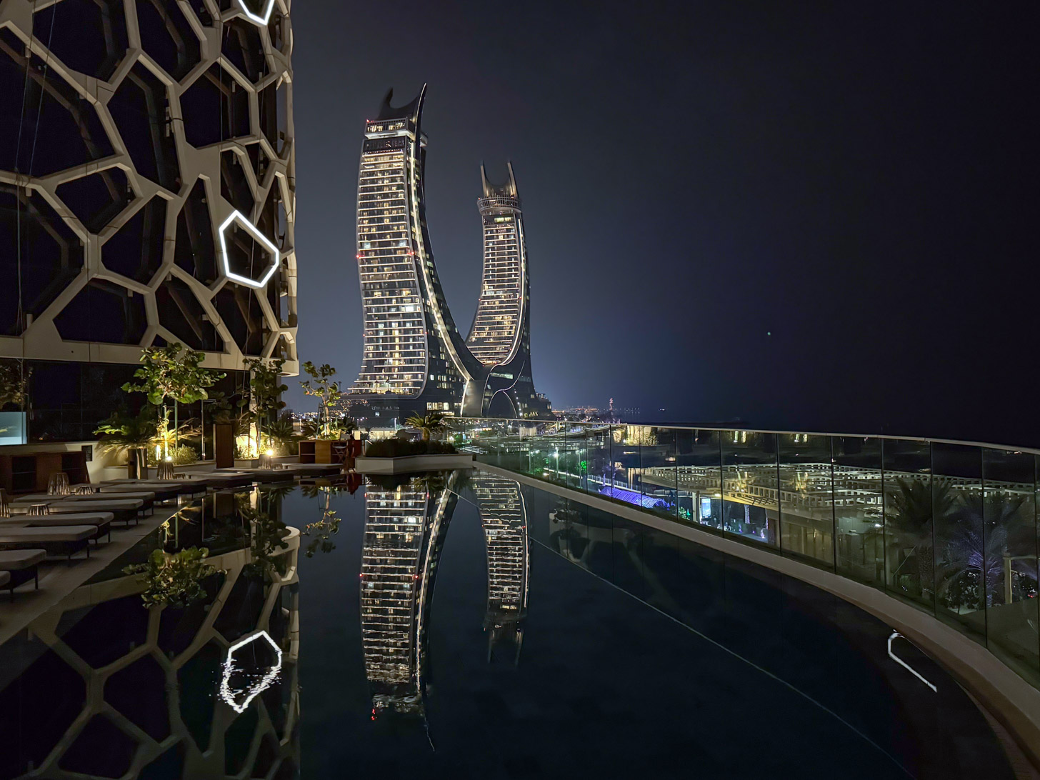De Katara Towers, gezien vanaf het zwembad van het Rosewood Doha hotel. De twee imposante torens vormen samen de vorm van de sabels uit het nationale embleem van Qatar: een krachtig symbool dat traditie en moderniteit verbindt. In de torens zijn twee luxe hotels gevestigd: Raffles Doha en Fairmont Doha, beide bekend om hun uitzonderlijke service en weelderige interieurs.