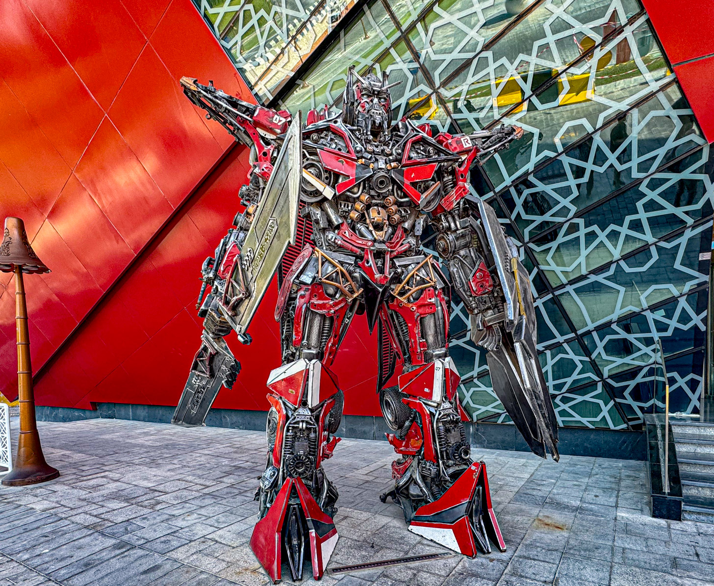 Over contrasten gesproken. Dit is één van de Transformers die je in Qatar kunt zien. Het beeld stelt een grote robot voor, opgebouwd uit auto-onderdelen, metaal en schroot, en is duidelijk geïnspireerd op de bekende Transformers-figuren uit film en popcultuur. Zulke beelden worden in Doha vaak gebruikt als moderne kunstinstallaties, waarbij hergebruikte materialen symbool staan voor innovatie en duurzaamheid. Dit zijn thema’s die Qatar graag koppelt aan zijn toekomstgerichte identiteit.